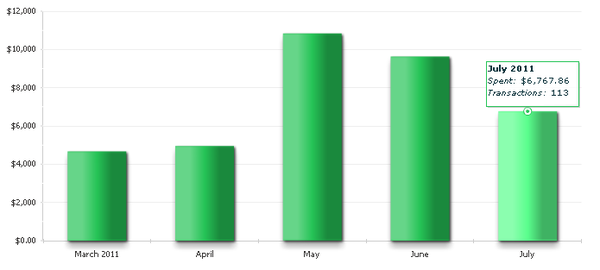 The last costs for the wedding (final payments to vendors), expenses from the honeymoon (food and festivities), and the booking of a stay at the same resort in Cabo during the next 18 months (more on that in a future post) caused July to be another expensive month. We spent $6,767.86 during July and have spent over $27,000 (regular and wedding expenses combined) in the past three months.